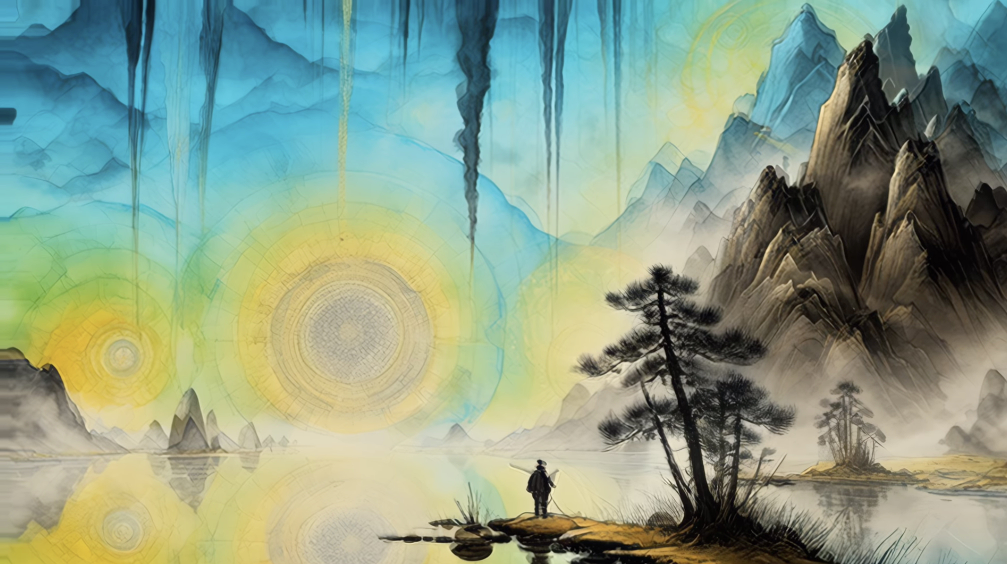 An ink-wash style landscape with mountains and pagodas, blending traditional art with psychedelic visuals.